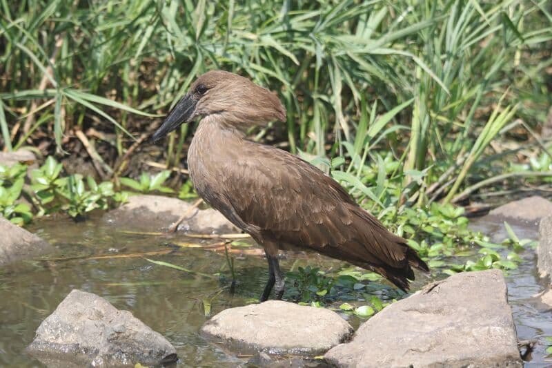 The hamerkop is a carnivorous bird that consumes fish and amphibians as the main part of their diet. They also consume small rodents, crustaceans and insects. Their diet is largely dependent on the regional availability.